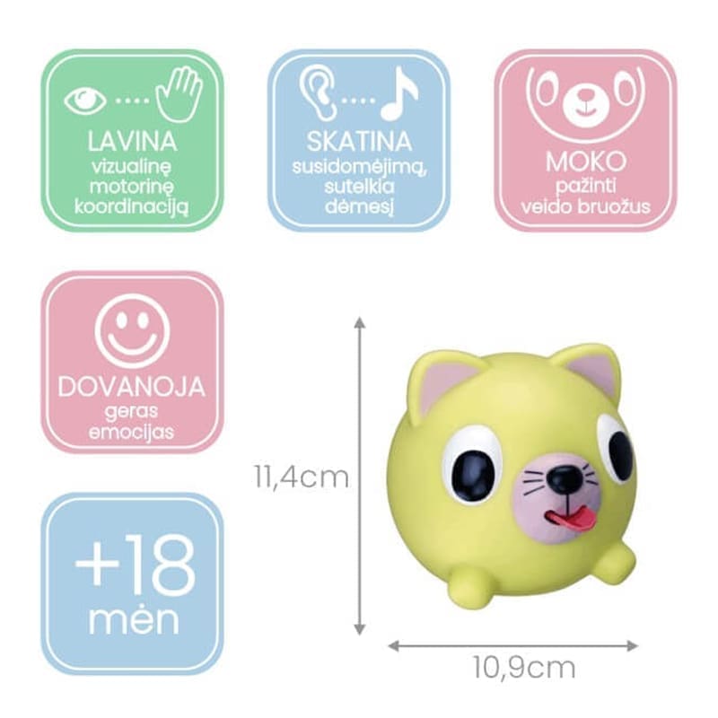 Garsą skleidžiantis mechanizmas yra mechaninis, todėl džiugins vaikutį ilgą laiką. Skirti vaikams nuo 18 mėn. Vaikas gali išsirinkti jam labiausiai patinkantį gyvūną (meškutį, kiškutį, šuniuką, katytę ar vienaragį) ir mėgstamą spalvą.