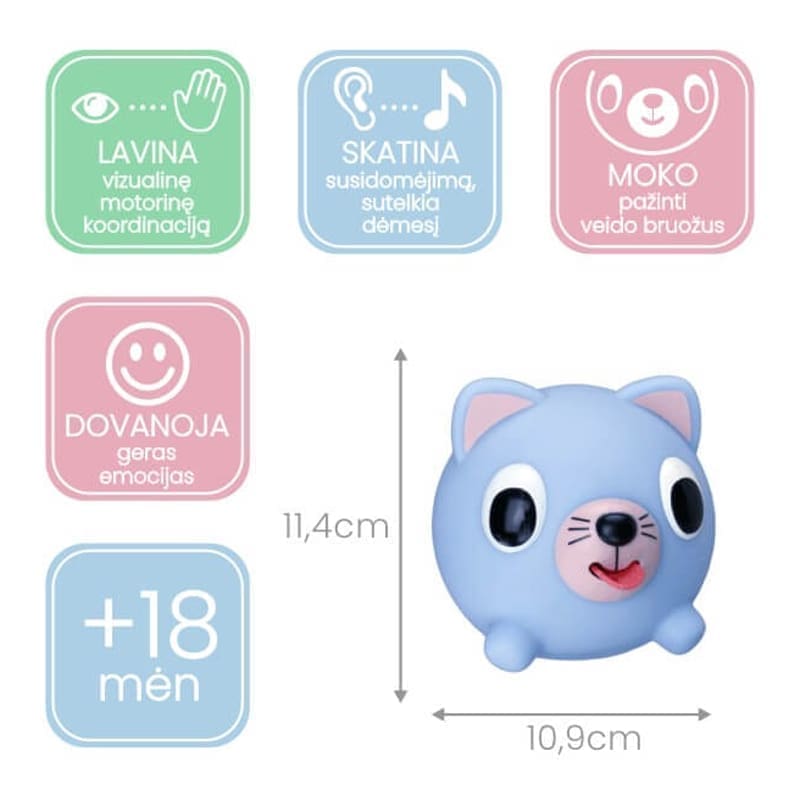 Garsą skleidžiantis mechanizmas yra mechaninis, todėl džiugins vaikutį ilgą laiką. Skirti vaikams nuo 18 mėn. Vaikas gali išsirinkti jam labiausiai patinkantį gyvūną (meškutį, kiškutį, šuniuką, katytę ar vienaragį) ir mėgstamą spalvą.