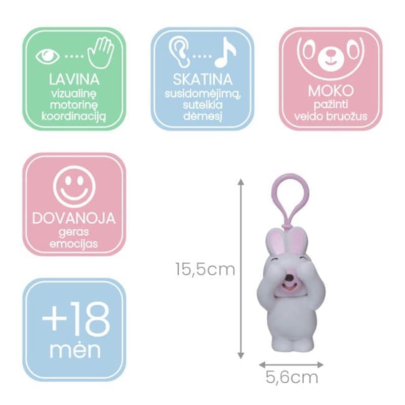Garsą skleidžiantis mechanizmas yra mechaninis, todėl džiugins vaikutį ilgą laiką. Skirti vaikams nuo 18 mėn. Vaikas gali išsirinkti jam labiausiai patinkantį gyvūną ir mėgstamą spalvą. Galima rinktis iš keturių gyvūnų – rožinės katytės, melsvo šuniuko, balto kiškučio ir rudo meškučio.