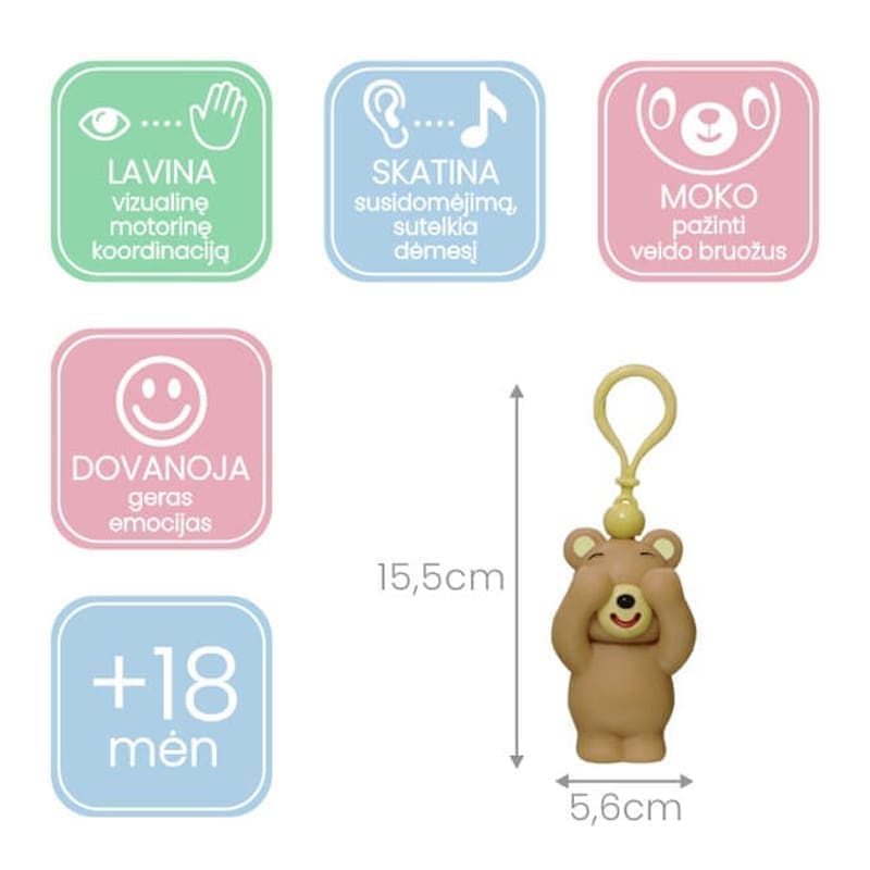 Garsą skleidžiantis mechanizmas yra mechaninis, todėl džiugins vaikutį ilgą laiką. Skirti vaikams nuo 18 mėn. Vaikas gali išsirinkti jam labiausiai patinkantį gyvūną ir mėgstamą spalvą. Galima rinktis iš keturių gyvūnų – rožinės katytės, melsvo šuniuko, balto kiškučio ir rudo meškučio.