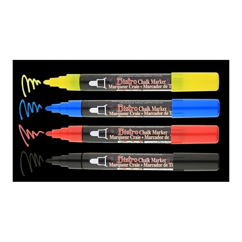 Kreidiniai markeriai Bistro Chalk Marker – tai geriausiai parduodamas MARVY UCHIDA produktas! Ypatinga šių markerių skystos kreidos rašalo formulė sukurta ir idealiai tinka kreidinių, prezentacinių lentų, švieslenčių, stiklo, langų ir bet kokių lygių paviršių (ne akytų!) dekoravimui. Netoksiški, sodrių ir ryškių spalvų (nepermatomi), vandens pagrindo markeriai greitai džiūsta, jais dekoruotus paviršius ir užrašus paprasta ir lengva valyti drėgna šluoste. Jūsų dekoracija išliks ryški iki kol nuspręsite ją nuvalyti. Šie markeriai – kaip tikra kreida!