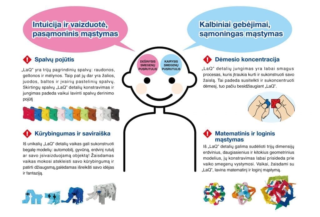 - „LaQ“ lavina erdvinius gebėjimus, problemų sprendimo įgūdžius ir loginį mąstymą. Vaikai turi nuspręsti, kokią spalvą pasirinkti, kur, kaip ir kokias detales naudoti, kad galėtų sukonstruoti norimą kūrinį;